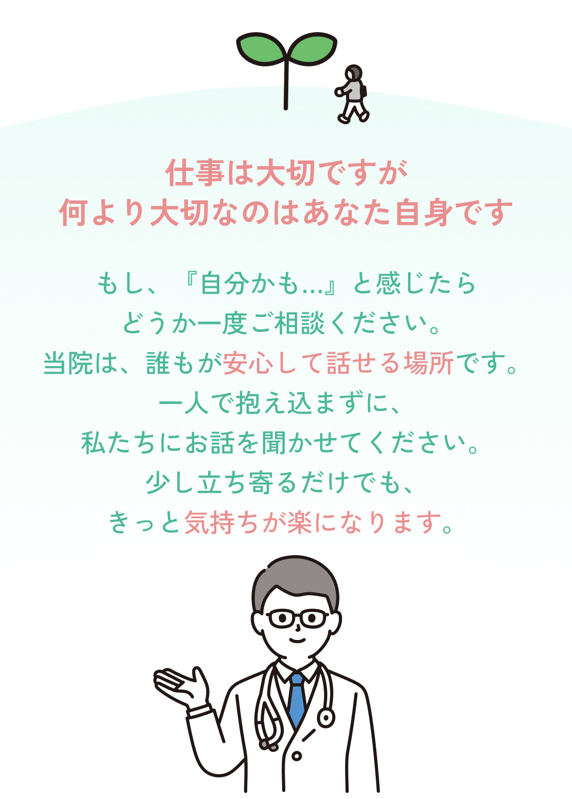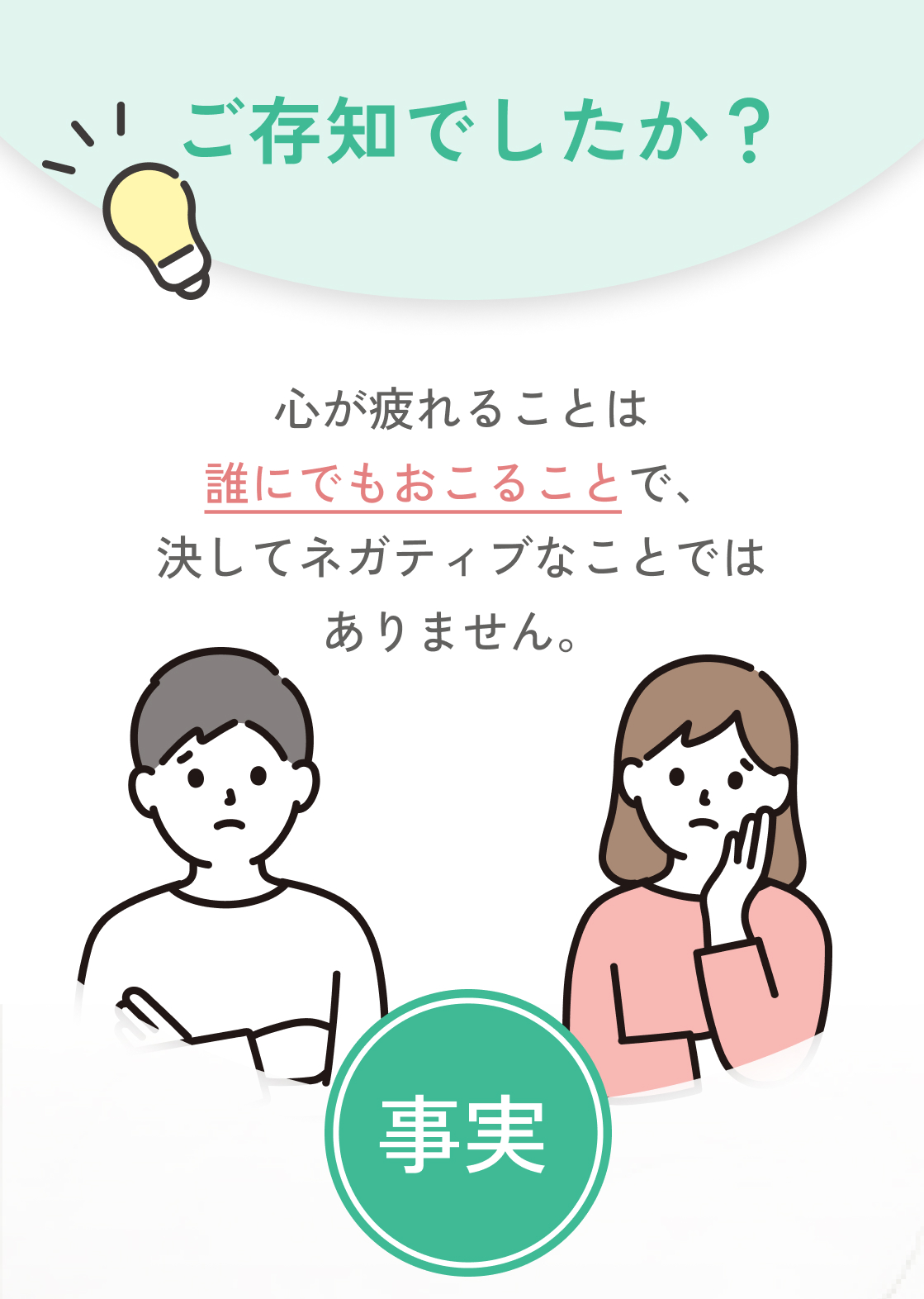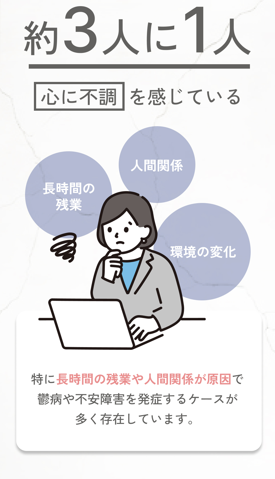 少しでも気分が優れない、体調が悪いというときは心が疲れてしまっているサインの可能性があります。風邪と同じように早めに対応することで、心を休ませてあげることが重要です。