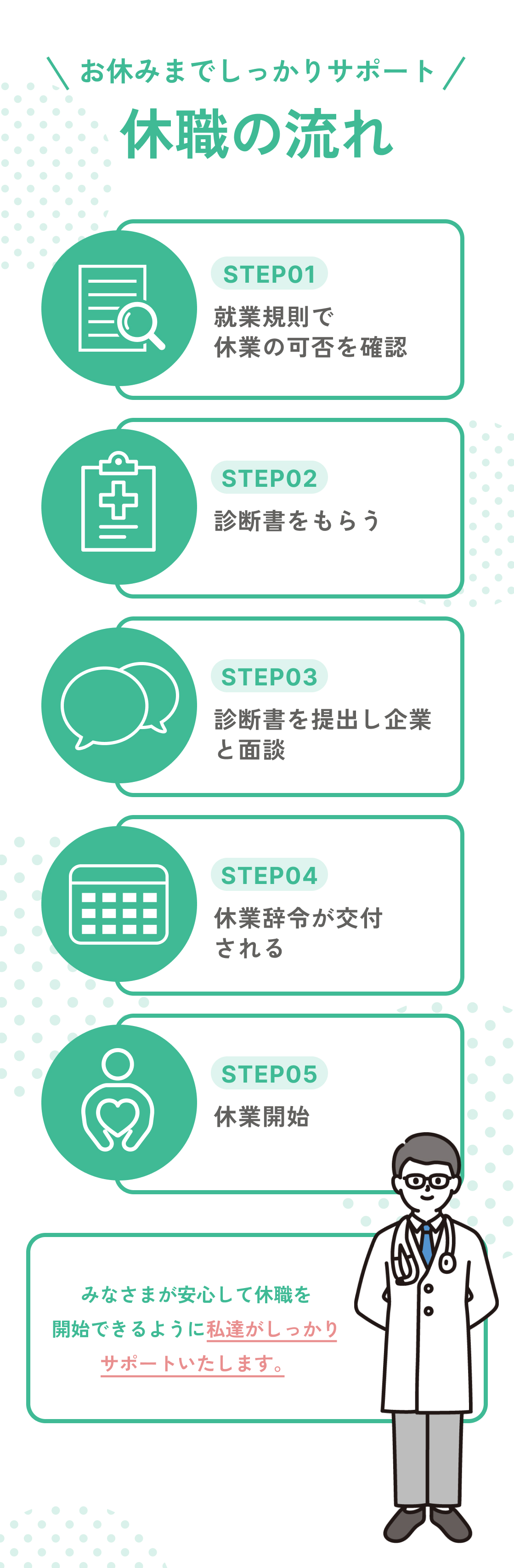 休職をご希望の場合には、まず就業先毎に休職の取扱いが異なる可能性があるため、各職場に手続きの流れをご確認ください。