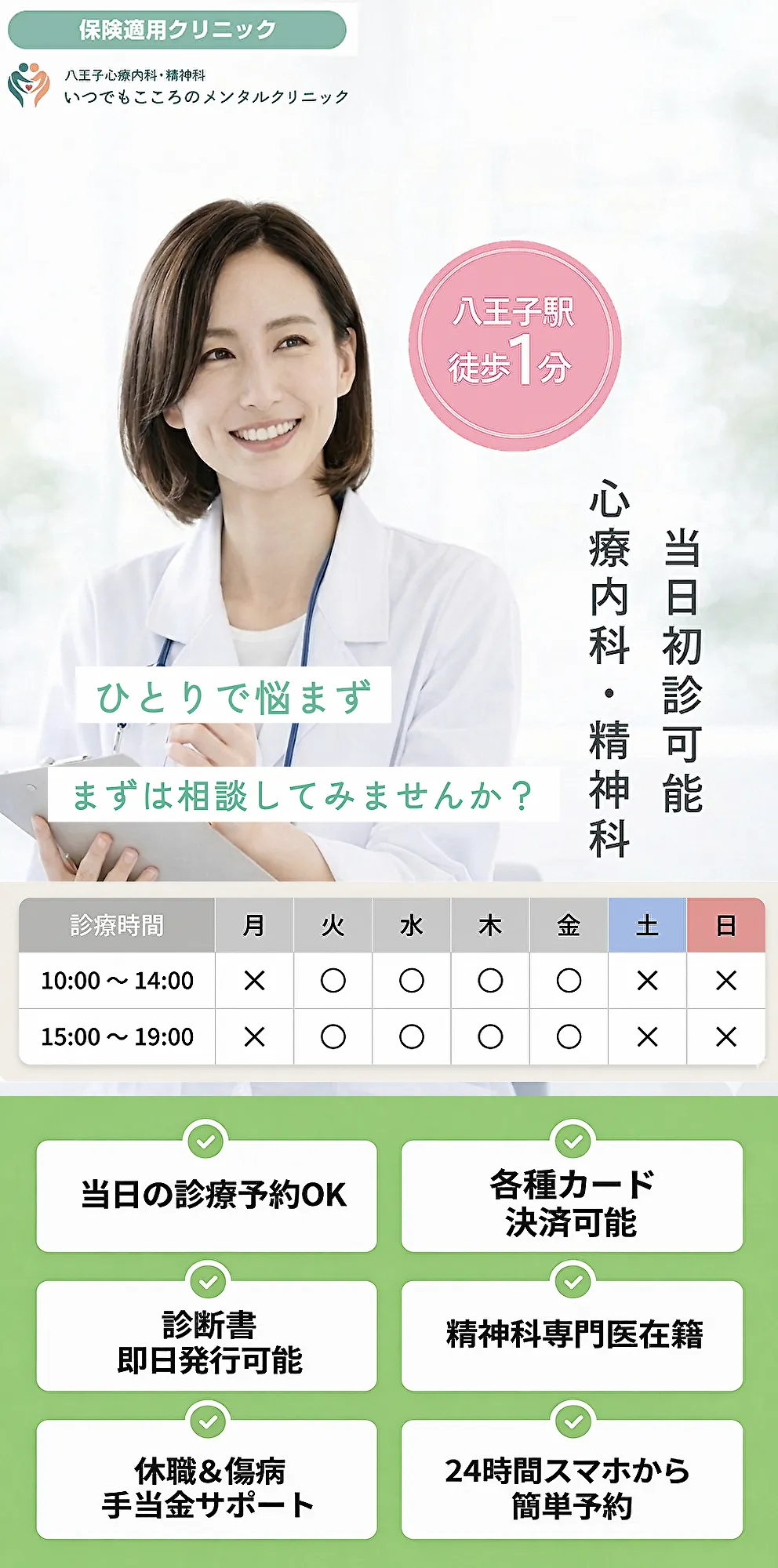 当院では、お薬だけの処方には対応しておりません。こころの病気の状態は日々変化しますので、その都度診察を行い患者様の状態を医師が適切に把握した上で、そのたびに最善の治療内容をご案内しております。診察のご予約は当院のホームページ、またはお電話からお気軽にご連絡ください。