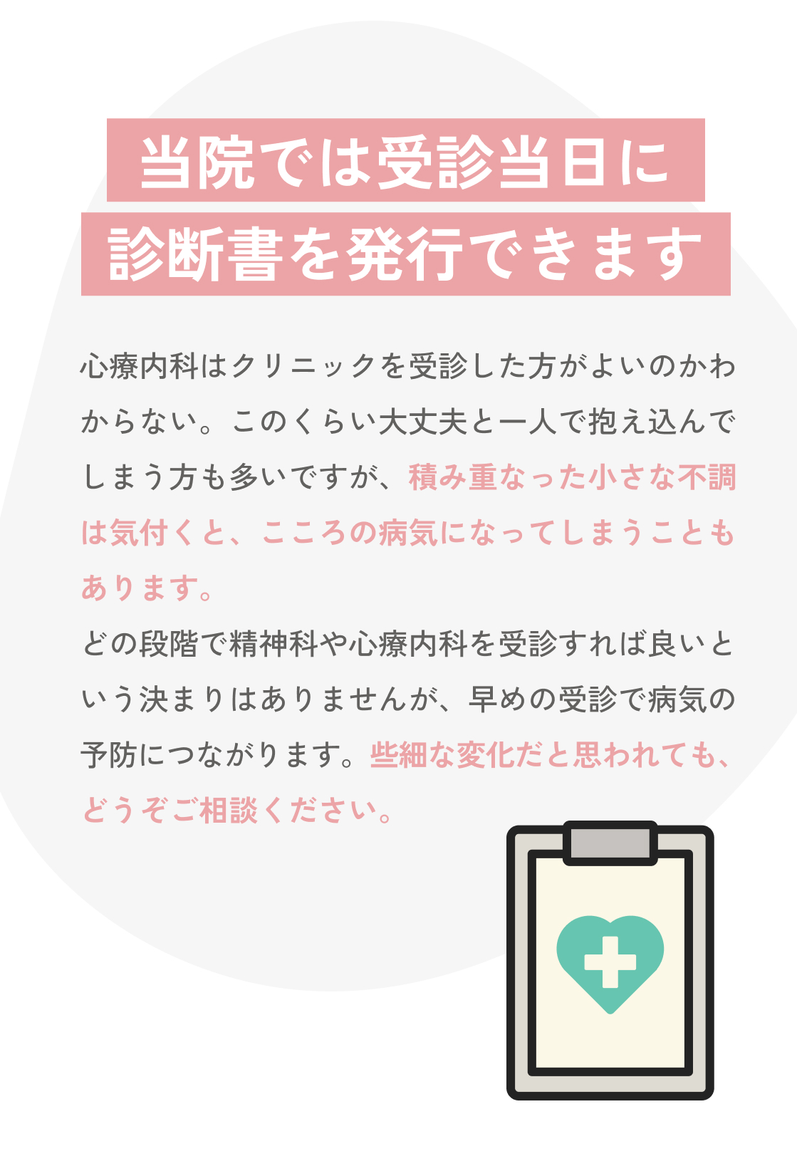 休職するなどで診断書が必要な場合、診察時もしくは事前の問診時にご遠慮なくお申し出ください。医師の診断によって必要と判断された場合には、当日の診断書発行も対応しております。