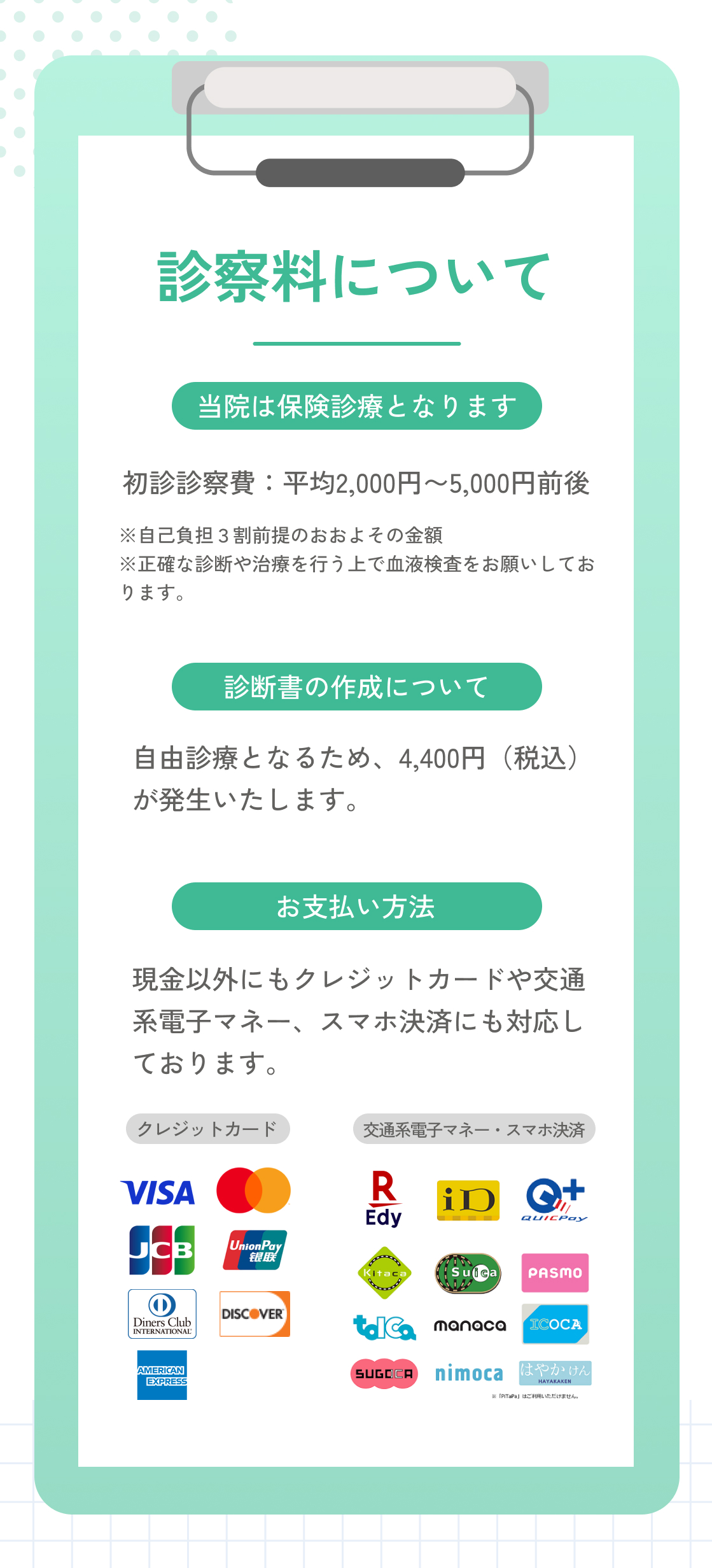 別途、診断書の作成については自由診療となり、4400円(税込)が発生致します。また、当院ではクレジットカードや交通系ICなど様々な支払い方法にも対応しております。
